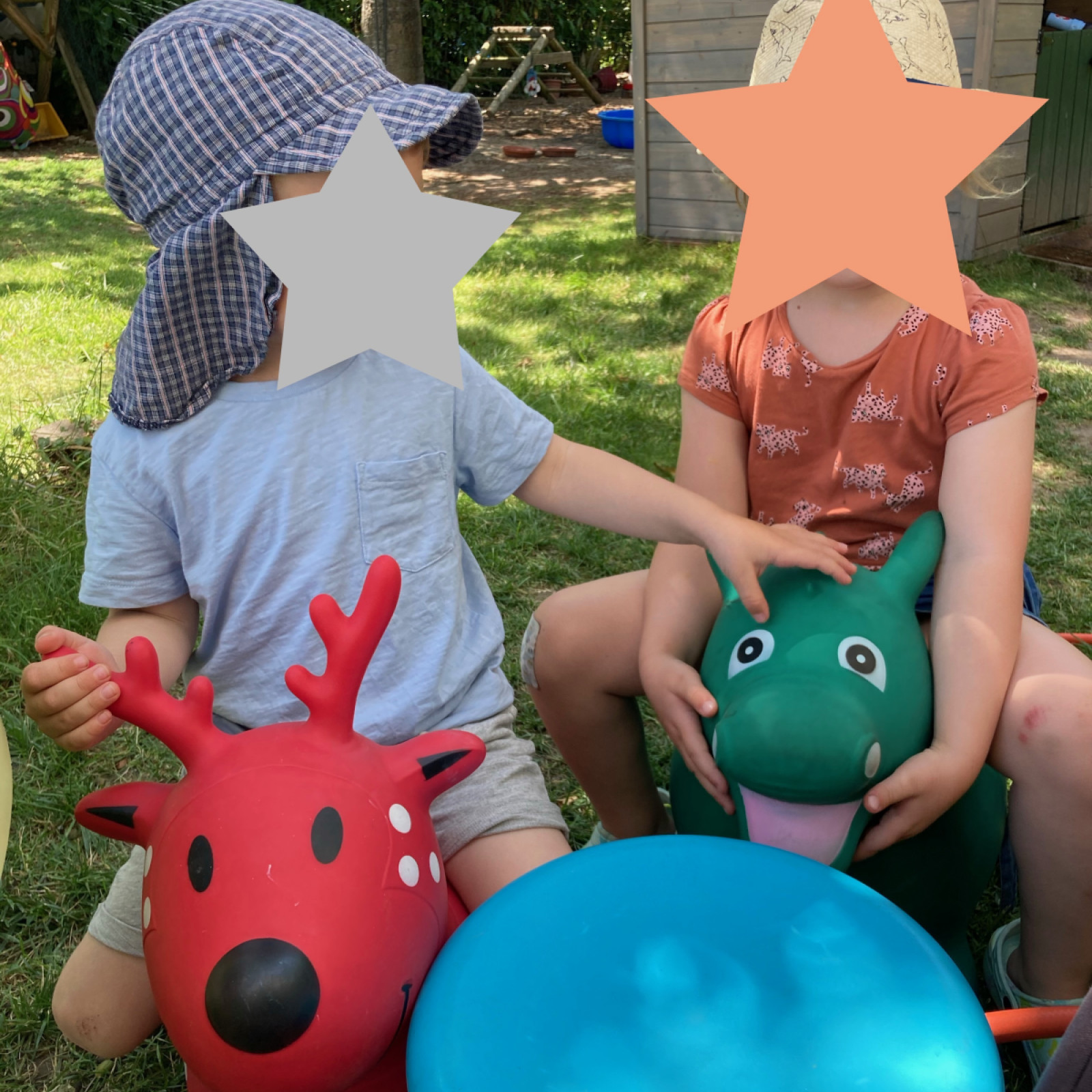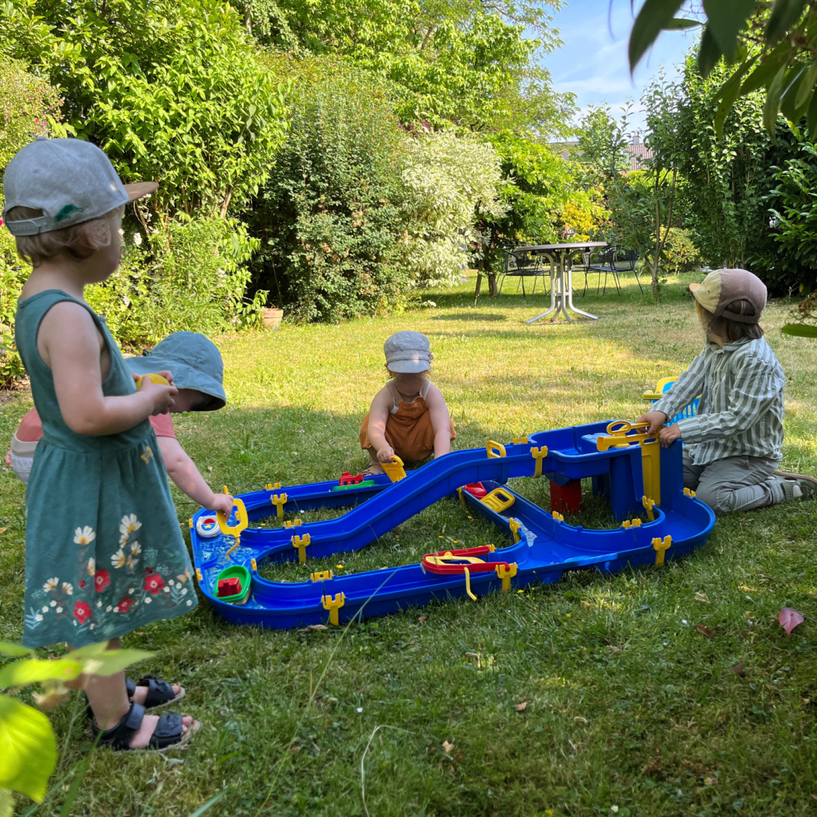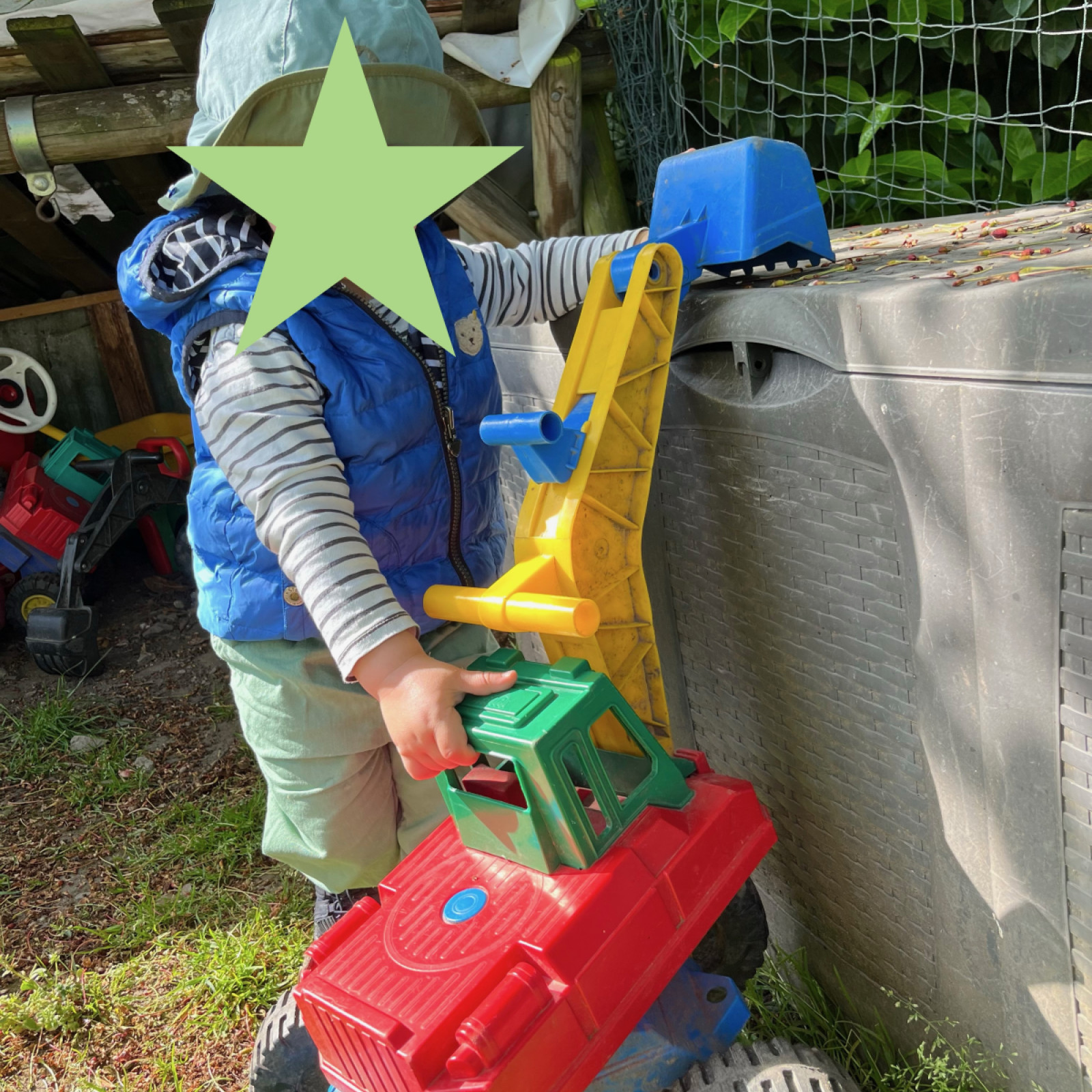 Im Garten steht neben den Rutschen ein großer „Fuhrpark“ (Bagger, Bobby-Car, Roller, Dreirad...) zur Verfügung.