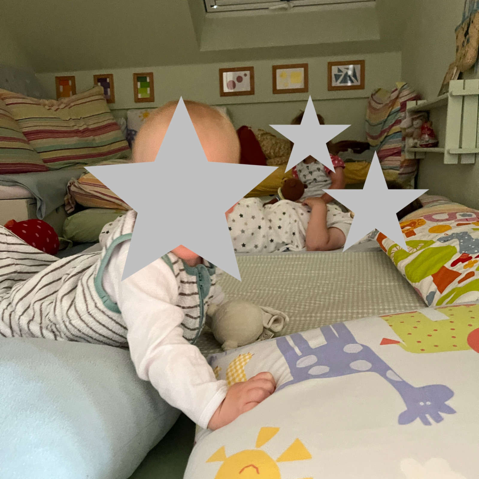 Ein weiteres Spielzimmer mit Schlafbereich befindet sich in der 1. Etage. Hier gibt es kein Gitterbett: für den Mittagsschlaf legen wir die Matten und Matratzen aus. Jedes Kind legt sich erstmal hin und entscheidet, ob und wie lange es schläft. Manche Kinder brauchen ihre Zeit aber am Ende schlafen doch alle ein!