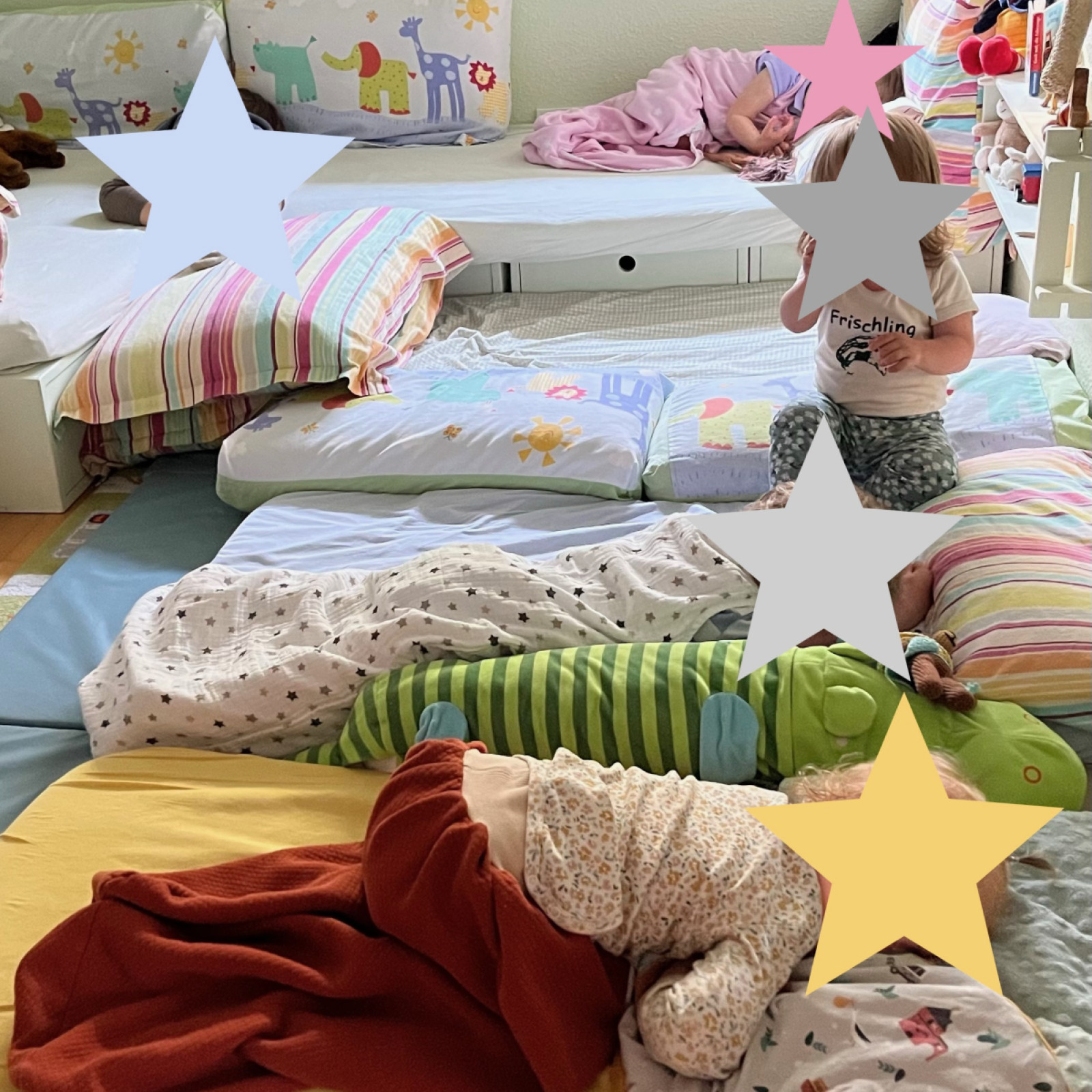 Jedes Kind hat seinen eigenen Platz zum Schlafen mit eigener Matratze, Betttuch, Kopfkissen, Schlafsack oder Decke, Schmusetier (oder Schnuller, wenn noch benötigt, NUR im Bett zum Einschlafen).